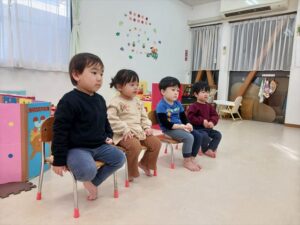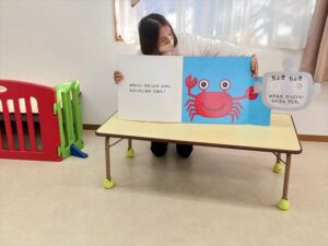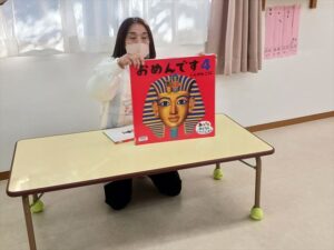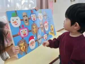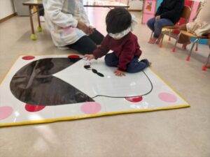 先生からの出し物は「おめんです4」の大型絵本でした😀おめんを被っている動物の名前を当てたり一緒に言ったりして楽しんでいました🎭